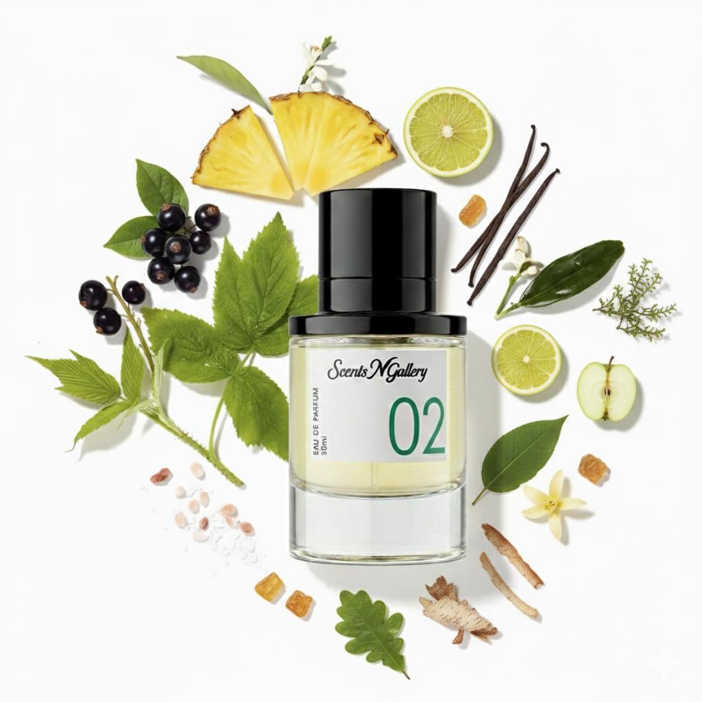 Essence: Inspired by the iconic Aventus, 2 by Scents N Gallery captures the essence of bold masculinity. Fresh pineapple and apple meet smoky birch and rich oakmoss, creating a refined yet powerful scent.